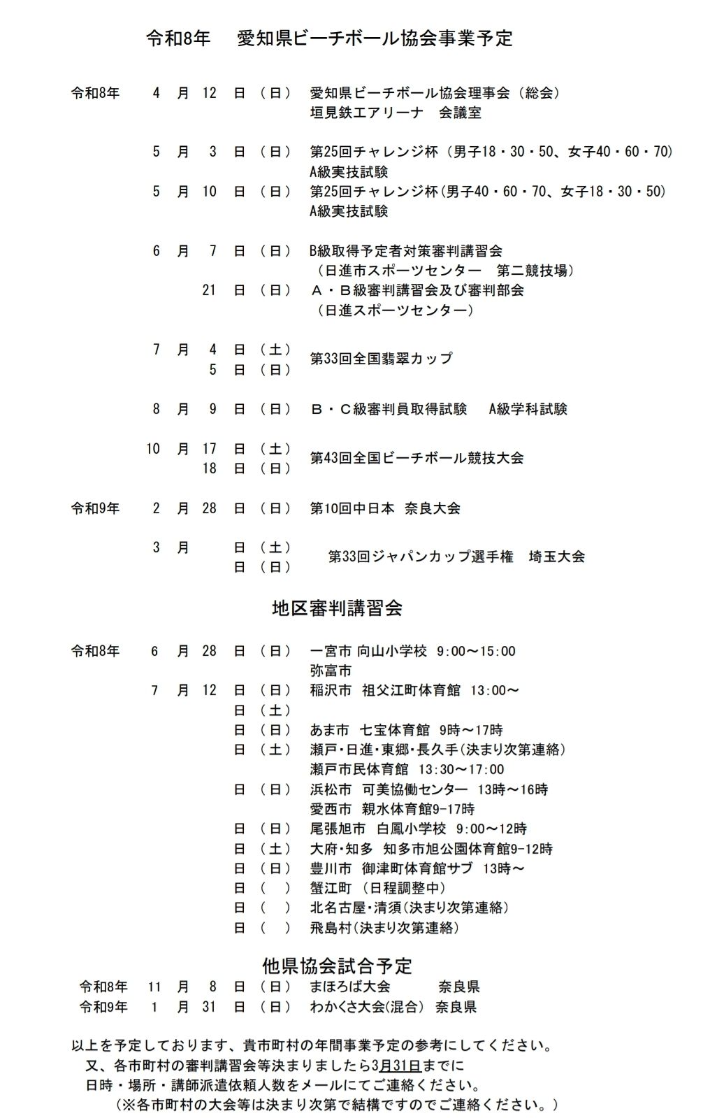 ビーチボール協会 協会資料 愛知県ビーチボール協会 県登録規定ダウンロード 愛知県ビーチボール協会 試合参加規定ダウンロード 令和8年度 愛知県協会 事業予定 ダウンロード チーム登録制申請書ダウンロード オーダー表(A4 6組) オーダー表(A4 6組)